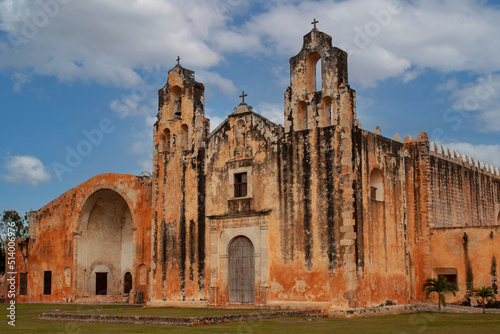 © Daniel, Obraz premium An exterior view of the historical Church and Convent of San Miguel Arcangel in Maní, in the central region of the Yucatan Peninsula, in the Mexican state of Yucatán, Mexico. It was built in 1549.