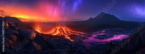© ColleAno, Fototapeta premium An extraordinary perspective of a remote volcanic island with a glowing lava dome and a rare, deep purple aurora australis casting an ethereal light over the volcanic landscape, Volcanic island scene