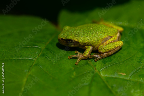 © Grandbrothers, Obraz premium An extreme close up image of a Hyla Versicolor, a tiny native tree frog, on a tree leaf in Maryland. Texture of the slimy the skin of frog, fingers , eye and nostrils are distinguishable.