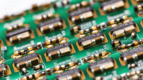 © Stockify Pro, Obraz premium An extreme close-up of a sensor interface board, medium green PCB, jam-packed with small integrated circuits, diode arrays, passive components, and many delicate soldered connections, viewed slightly