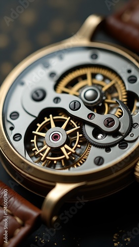 Fototapeta premium An extreme macro shot of the intricate inner mechanism of a vintage watch, with tiny gears and springs catching the light