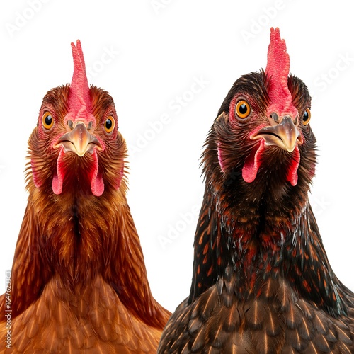Fototapeta premium An eye-catching image of two farm animals, a pair of chickens, with vibrant red and brown colors.