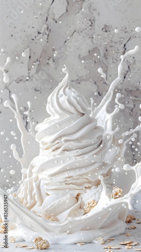 © Jolanta, Fototapeta premium An ice cream sundae made of white chocolate, vanilla ice cream and vanilla wafer, splashing with milk in the air, ice cubes, granola pieces,