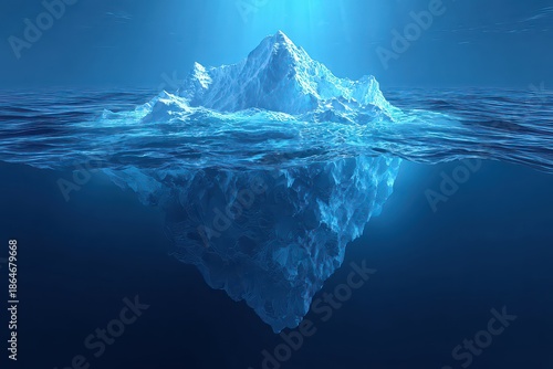© Hifza, Obraz premium An iceberg danger awareness visualization is presented in passive voice, underwater ice reveals true scale, melting textures suggest warming climate, realistic 3D render quality is strong