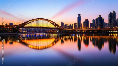 © THUA, Naklejka premium An iconic suspension bridge glowing in the dusk, its reflection rippling on calm water, with a tranquil city skyline setting the perfect tourism atmosphere.