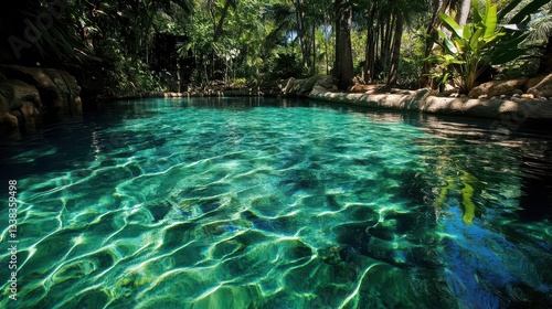 © Som, Naklejka premium An idyllic, clear pool water with no ripples, capturing the smooth, glass-like surface that reflects the surrounding tropical scenery.