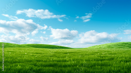 Fototapeta premium An idyllic countryside view featuring a green grassy field and a bright blue summer sky