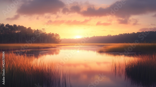 © Sawyer0, Fototapeta premium An idyllic landscape where the still water of the marsh reflects the setting sun, surrounded by tall grasses and a line of trees in the distance.