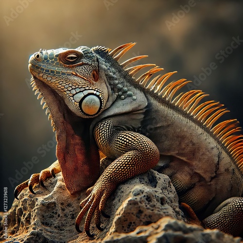 Naklejka premium An iguana basking on a sunlit rock with intricate scales and a r
