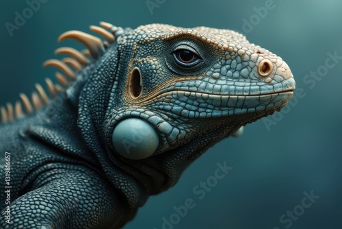 © cff999, Fototapeta premium an iguana with a blue head and blue eyes