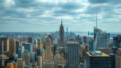 Naklejka premium An illuminated aerial view of the New York City skyline at night, reflecting...
