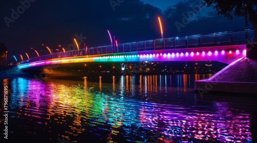 Obraz premium An illuminated bridge at night, with colorful lights reflected in the...