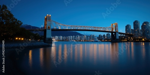 © Armin, Fototapeta premium An illuminated bridge over the water, connecting a vibrant cityscape at dusk with glowing urban reflections.