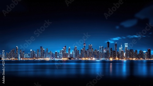 © Alex, Obraz premium An illuminated city skyline at night, showcasing modern skyscrapers reflected in calm waters. The vibrant blue hues create a serene and captivating urban atmosphere.