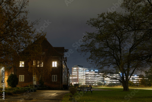 © DBA, Fototapeta premium An illuminated historic brick building and a large tree frame a grassy park contrasting with brightly lit modern office towers under a dark night sky.
