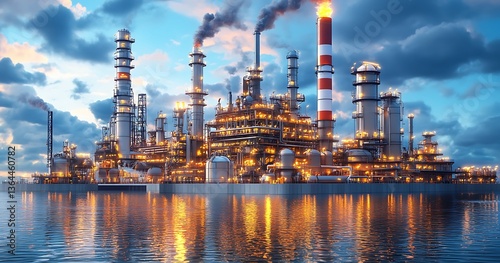 © Koplexs-Stock, Fototapeta premium An illuminated industrial complex reflects on a calm water surface