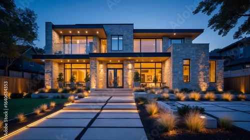 © Null Island, Obraz premium An illuminated modern home with stone facade and elegant landscaping at dusk.