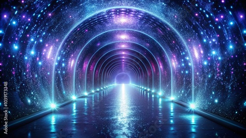 Naklejka premium An illuminated pathway through a cosmic tunnel of glowing rings, a journey into a fantastical realm where the stars shimmer with ethereal radiance