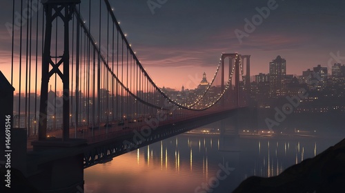 © THUA, Obraz premium An illuminated suspension bridge glowing at twilight, its elegant cables reflecting in serene water below, with a tranquil cityscape in the dusky background.