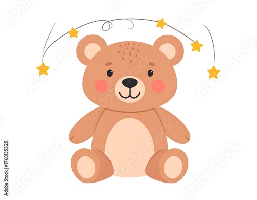 Obraz premium An illustrated, cartoon teddy bear seated below stylized hanging stars
