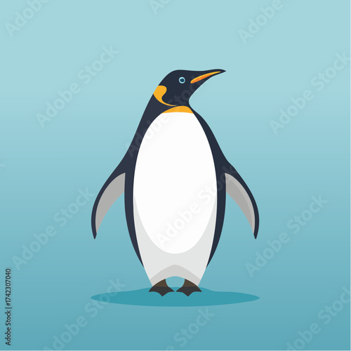 © Benxiumo, Fototapeta premium An illustrated king penguin on a clear blue background, showcasing a majestic bird with vibrant colours.