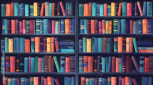 Fototapeta premium An illustration depicting multiple shelves loaded with various colorful books. The lively design brings out a sense of abundance and knowledge, perfect for a bibliophile.