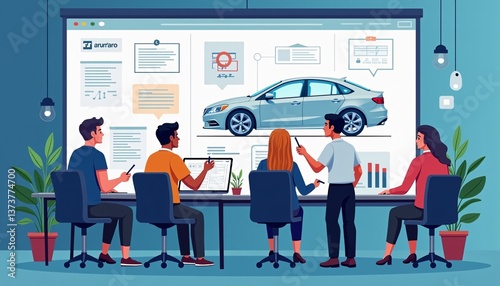 Fototapeta premium An illustration of a car manufacturer's team brainstorming new designs.