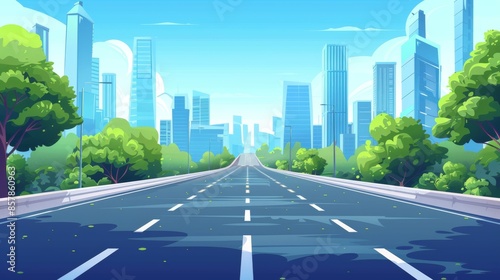 © Bundi, Fototapeta premium An illustration of a curve bridge road leading to a city with skyscrapers. Illustration of a town landscape with multi-storey buildings, highways, and green trees on a sunny summer day. Speed freeway