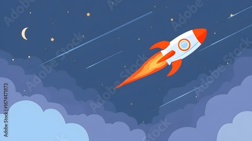 © Oksana_Tukane, Naklejka premium An illustration of a rocket is flying in space. Start-up concept. flat illustration.