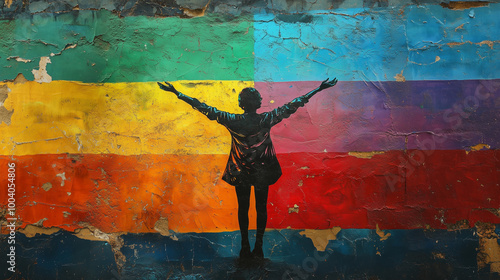 Obraz premium An illustration of woman standing against a rainbow-colored background, symbolizing LGBTQ pride, diversity and freedom.