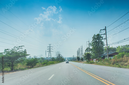 © Palakorn Jaiman, Fototapeta premium An image of a car cruising along an open road with trees and lampposts along the way against a background of sky and clouds.