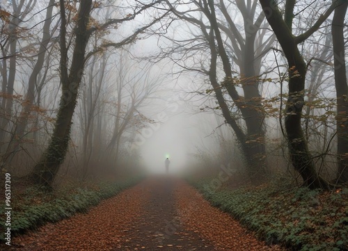© monkik, Naklejka premium An image of a dense overgrown forest with a foggy sky