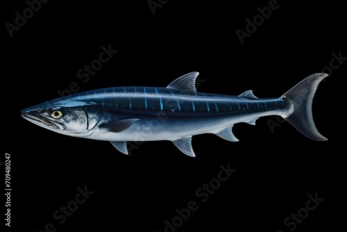 Naklejka premium An image of a fish, resembling a blue shark or thresher shark human hybrid, is seen against a black background.