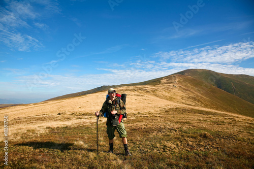 © Mykola Velychko, Fototapeta premium An image of a man walking in mountains
