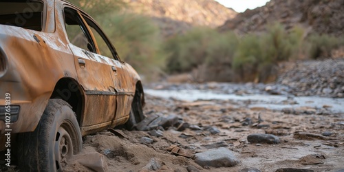 © gunzexx png and bg, Fototapeta premium An image of a rusted, abandoned car sinking in sand amidst a desert landscape, highlighting decay and abandonment in a barren, sunlit environment.