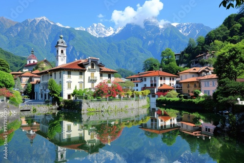 © Matthias, Naklejka premium An image of a serene lake reflecting the surrounding mountains and sky, creating a mirror-like surface that perfectly captures the tranquility of natur