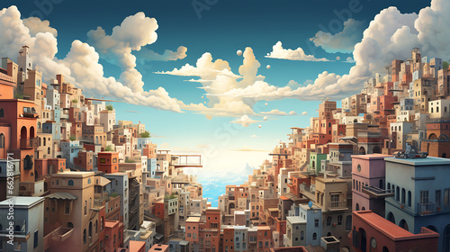 Fototapeta premium An image of a surreal cityscape, where buildings are made of giant puzzle pieces, floating in the sky and fitting together seamlessly, symbolizing the interconnectedness and harmony of urban li