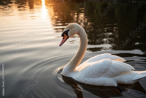 © Kritsapakon, Naklejka premium An image of a white swan swimming in a golden-lit atmosphere.