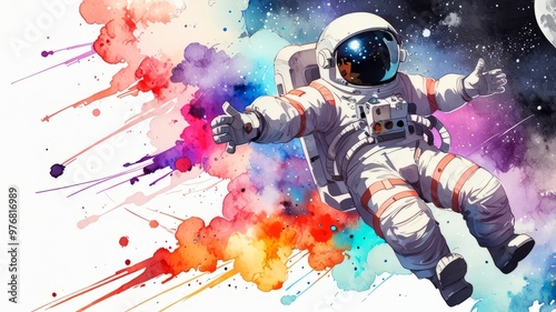 © Anna, Obraz premium An image of an astronaut in space in watercolor style. World Space Week.