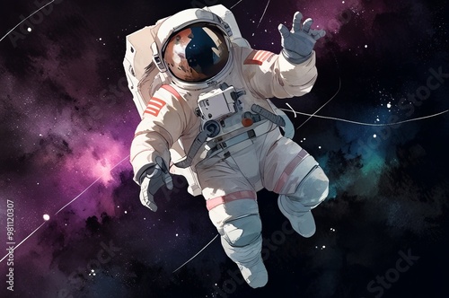 © Anna, Fototapeta premium An image of an astronaut in space in watercolor style. World Space Week.