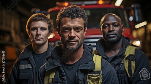 Fototapeta premium An image of firefighters waiting outside of a fire engine .