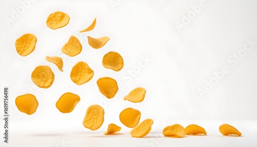 Fototapeta premium An image of multiple golden yellow potato chips with irregular shapes and a...