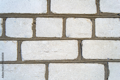Fototapeta premium An image of the texture of a brick wall with a coarse-grained, embossed surface. Small cracks and cement inclusions. Horizontal image.