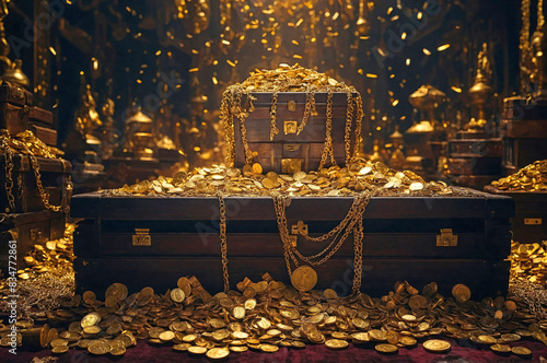 © AungMyintMyat, Fototapeta premium An image of treasure chests and gold coin, bar, chain