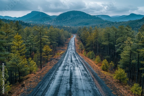 Fototapeta premium An image portraying a long, straight rain-soaked asphalt road running through a serene pine forest