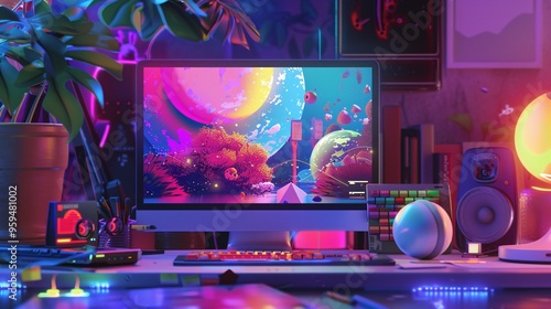 © Sinechana, Naklejka premium An imaginative scene where a computer screen displays a vivid, colorful illustration being generated by artificial intelligence. The environment is a modern workspace with digital art tools and
