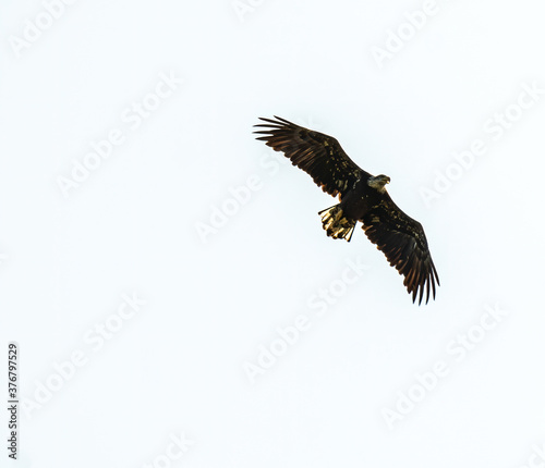 © Scott, Fototapeta premium An Immature Bald Eagle Flies over a Lake