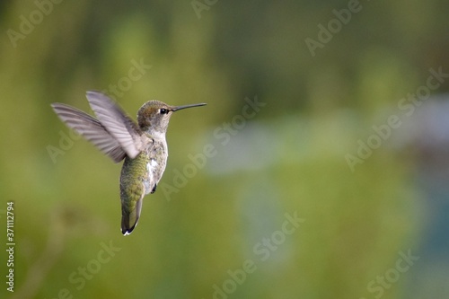 Obraz premium An immature male Anna's hummingbird (Calypte anna) in flight in front of a blurred background