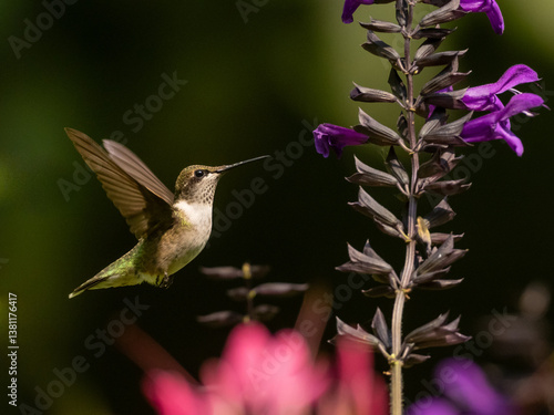 Fototapeta premium An immature male Ruby-throated Hummingbird about to feed at a stalk of purple flowers