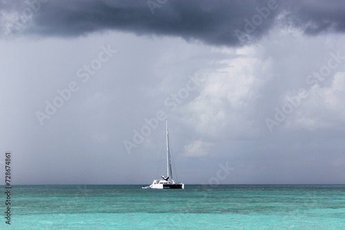© tg-photo, Fototapeta premium An impending storm in the Caribbean Sea. Turquoise water, white ship and storm clouds.